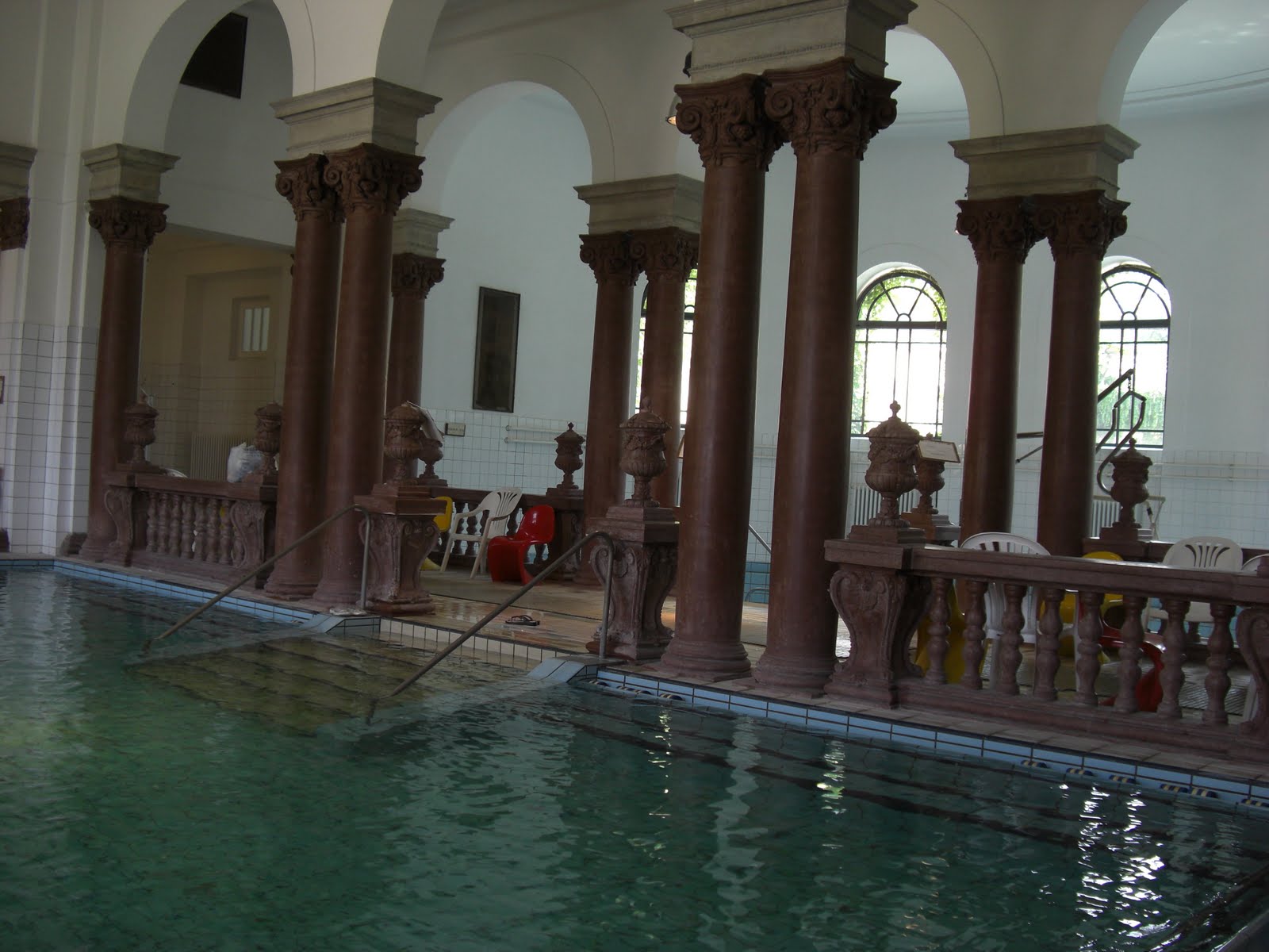 The first, Szechenyi Baths, is situated in a giant park and feels like you swimming in the courtyard of a Schloss. The buildings are painted yellow and the outdoor pools are surrounded by fountains and statues. There is a total